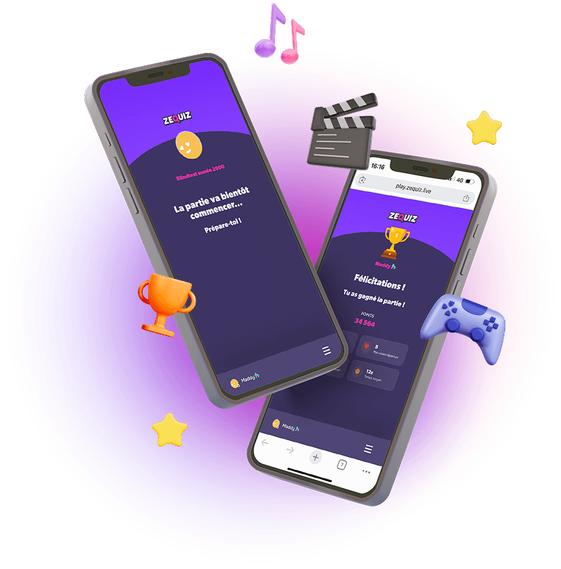 Create and host your events easily with ZeQuiz. Endless possibilities for organizing multi-player quizzes and blind tests, to build customer loyalty and to host your private events, even in front of 10,000 players!